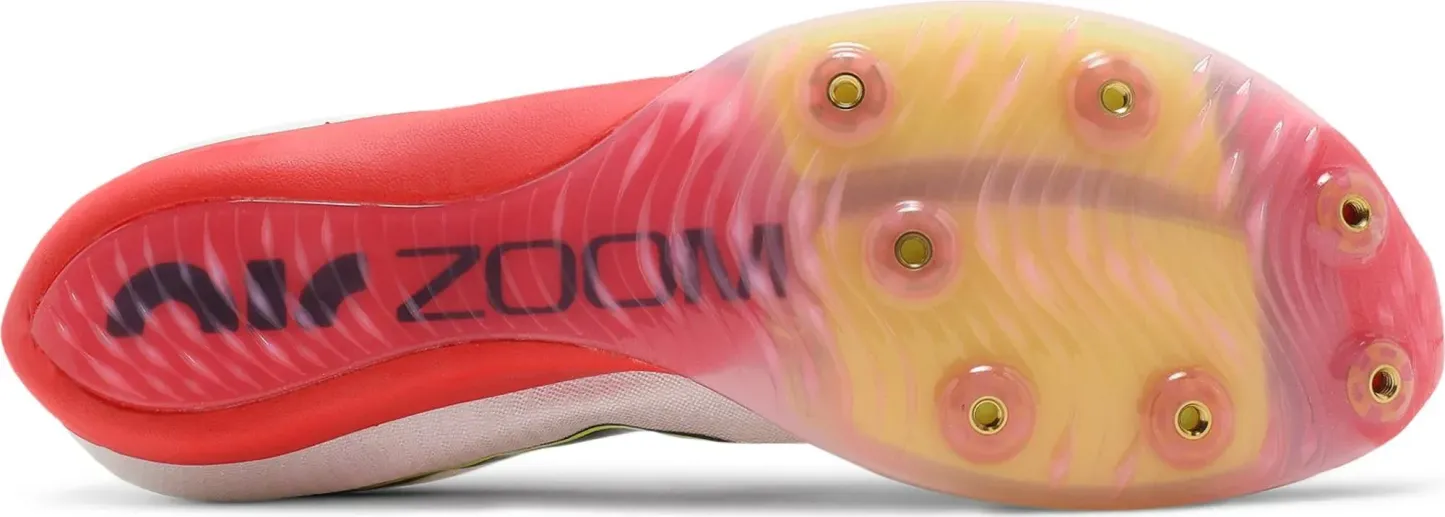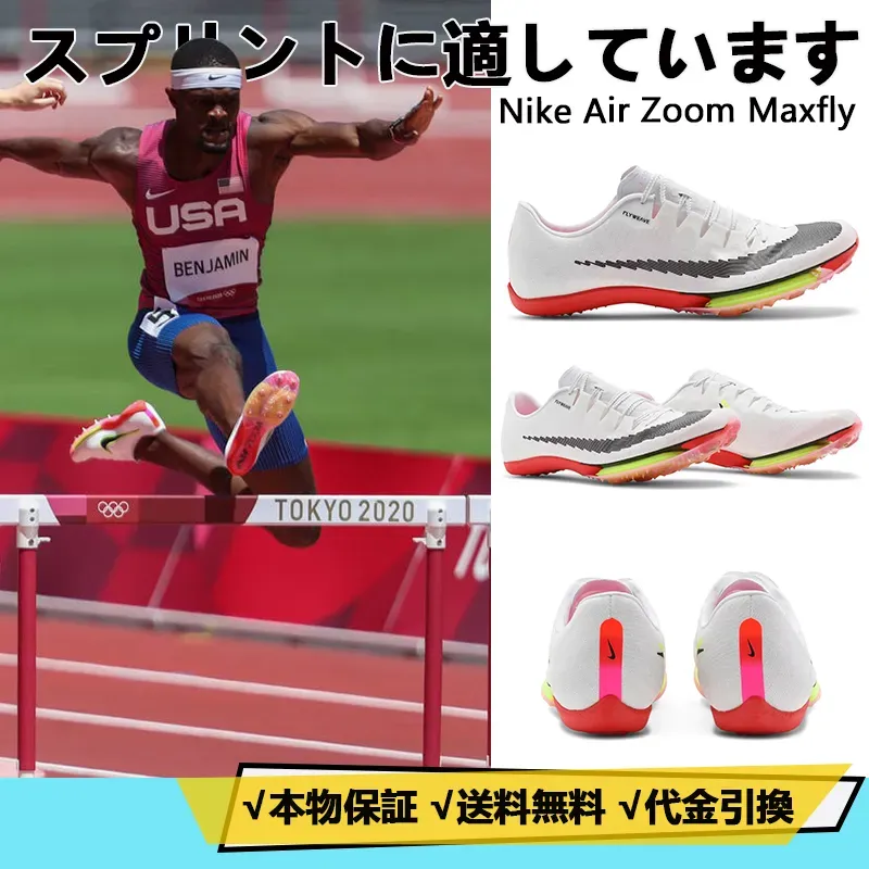 ナイキのトラック用スパイク、エア ズーム マックスフライは、2021 年 4 月に 100 ~ 400 メートルおよびハードル用に登場します。軽量で形状保持力(耐久性)の高いウーブン素材とシンセティック素材の複合アッパー、最高レベルの伸縮性を実現する「ダブルズームエア」、フルレングスのランニングシューズでおなじみのカーボンプレート。特に前足部には、蹴り出しに優れ、かつてない高反発で推進力をサポートする「ダブルズームエア」を搭載しているのが特徴。